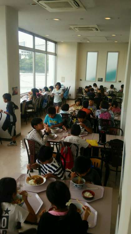 昼食は、自分たちの計画した好きな時間にとることができるシステムです。メニューは、カツカレー、ハンバーグセット、ラーメンセット、伊勢うどんセットの4つから選べます。どれにしようかな?