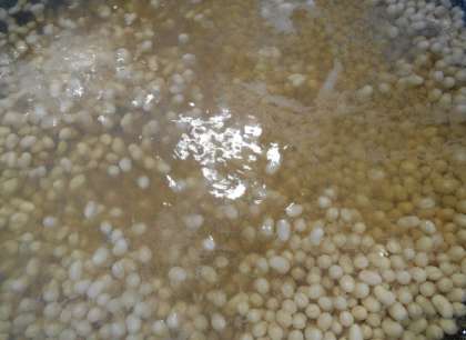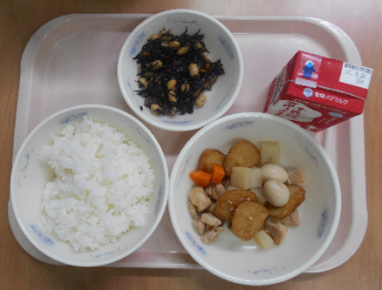 今日の給食は,ごはん・牛乳・平天とこんにゃくの煮つけ,ひじき豆でした。ひじき豆に入っている大豆は,缶詰ではなく,給食室で沸とうしたお湯に30分ほどつけた後,大きな釜でやわらかくなるまでゆがいていきます。その後,ひじき,にんじん,油あげと一緒に煮ると,さらにおいしくなります。