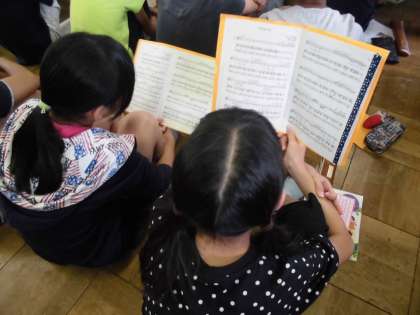 この日は英語が堪能な担任が発音をユニークな形で指導。みるみるうちに子どもたちの発音がネイティブのように!!そこにスクールサポーターの先生の見事な伴奏が加わります。