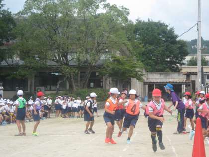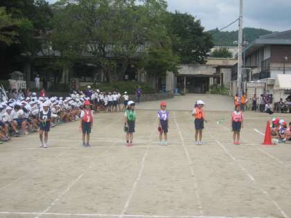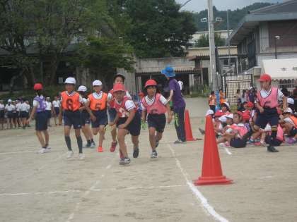 1・2年生はトラック半周,3年生はトラック1周を力いっぱい走りバトンをつないでいきます。午前中最後の競技に,会場は大盛り上がりでした。