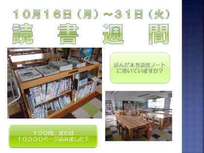 さて,今日より読書週間が始まります。楽しそうなイベントやキャンペーンが目白押しです。秋の夜長に,お家でも読書タイムを設けられてみてはいかがでしょうか?