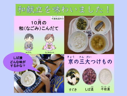 今日の給食は,麦ごはん・さんまのしょうが煮・小松菜とゆばの煮びたし・五色のすまし汁・しば漬の和(なごみ)献立でした。京の三大つけもののひとつ,しば漬が登場すると,子どもたちは興味津々!なすと赤じそを塩で漬けて作られていることを伝えると,「今まで何から作られているか知らなかった!」と言っている人が多くいました。どのような香りや味がしたでしょうか。また,今日の給食についてお家で話をしていただければと思います。