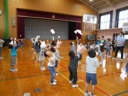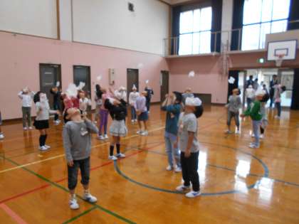 1年生は全員参加です!5.6年生のお兄さんお姉さんの合図で,顔にのせたティッシュを手などを使わずに,「フー!」と長く宙に浮かせられた人が勝ちです。