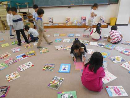 1つの部屋に並んだ,たくさんの数えきれないほどの本に,子どもたちは大喜び!いろんな本を見て,「嵯峨の図書館にあったらうれしいな。」の本を2冊選びました。