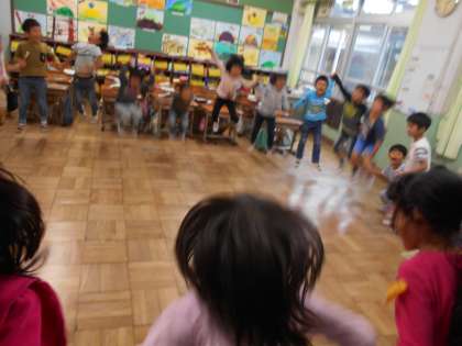 「天までとどけ,一,二,三。」と声を合わせて読むだけではなく,みんなで手をつないで大きなまるになり跳んでいました。子どもたちは実際に跳ぶことで,「みんなで跳ぶと楽しいし,くじらぐもに乗ろうと頑張れます。」「みんなで力を合わせて跳んだら乗れると思いました。」と「くじらぐも」の「一年二組の子どもたち」になりきることができました。
