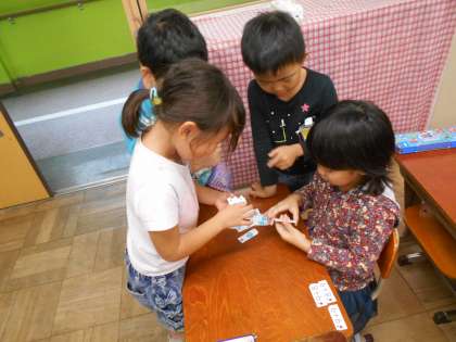 繰り上がりのないたし算・繰り下がりのないひき算のときも計算カードに取り組んでいましたが,今回も計算カードがあります。繰り上がりのあるたし算のカードの並び方を工夫して,美しい数字の並び方になるようにしました。グループで考え,相談しながらきまりに気付くことができました。
