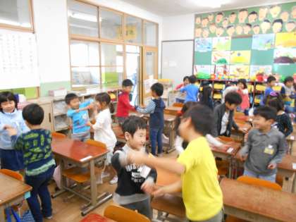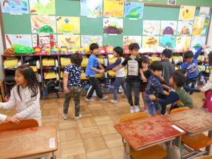 こねこがおどっている様子が,曲を聞いて伝わったようで,授業の最後の方には,こねこになりきり曲に合わせて踊っていました。最初は自分の席の近くで1人で体を動かしていましたが,自然と隣の人と手を取り合い,後ろのスペースに集まり楽しく踊っていました。