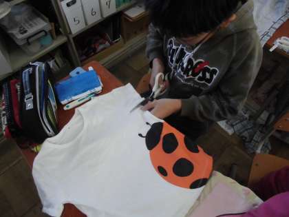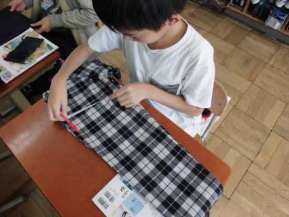 いろんなことを言いながら生地となる布製品を裁っているところです。