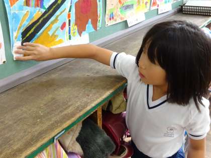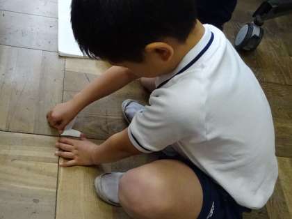 自分で作った紙の直角を様々なところにあててみる子ども達。