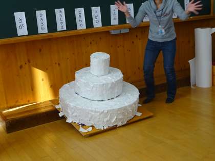 みんなで作業をすると,1時間で 大きな白いケーキができました。