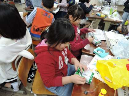 図書館の本を参考にして,どうやって動くようにしようか,材料や組み立てを考えながら作りました。