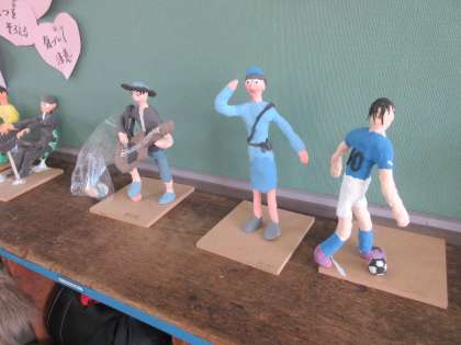 図工展に向けて立体の作品として,未来の自分の姿を思い描いて「未来の私」の制作に取り組んでいます。針金をしん材として,粘土で形をつくり,服装や周りの様子を工夫して,ていねいに作っています。