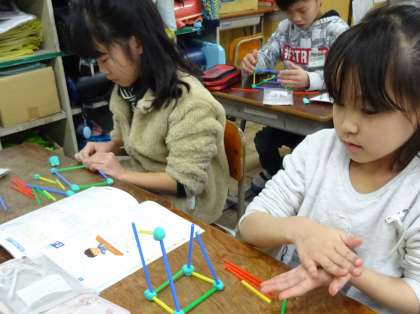 班で協力して仕上げ,同じ長さの辺がいくつあるかと頂点の数を確認。