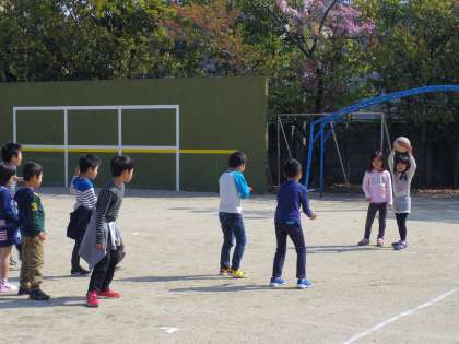 広いコートの中を動き回る子どもたち。中には、自分が捕ったボールを一度も投げていない子に渡してあげたり、相手を見てボールを投げたりしている子もいて、考えて活動しているのだなと感心させられました。