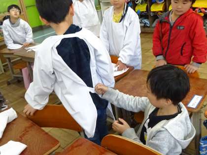 例えば,エプロンの後ろのマジックテープを止めること!