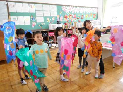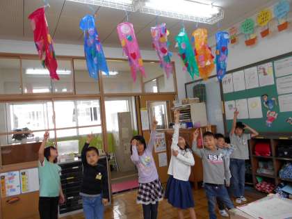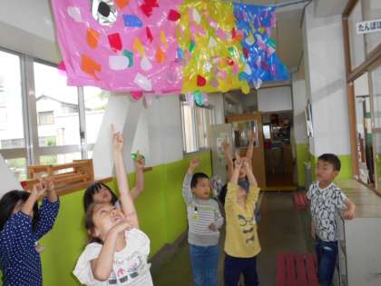 手に持って泳がせてみたり,教室と廊下につるした風で揺れるこいのぼりを見たりして楽しんでいます。