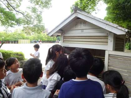 子どもたちは実生活から,天気によって1日の気温の変化は異なるのかどうか予想をたてて調べています。1時間ごとに百葉箱に気温を観測しに行き,徐々に変化する気温を棒グラフに記入していました。