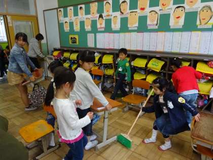 1年生も,6年生に手伝ってもらいながら,自分たちで掃除を始めています。