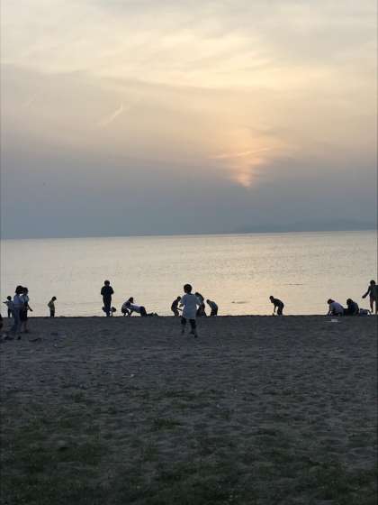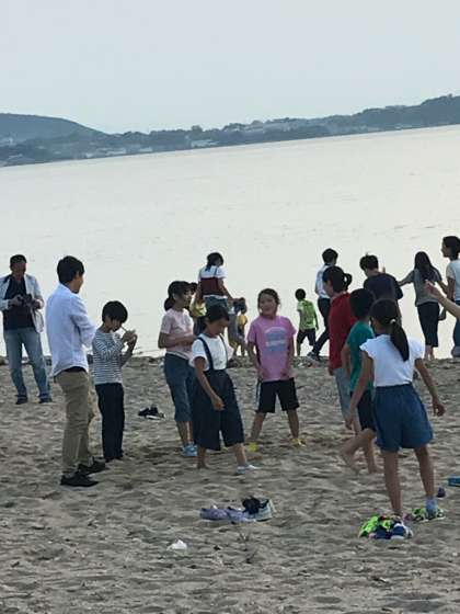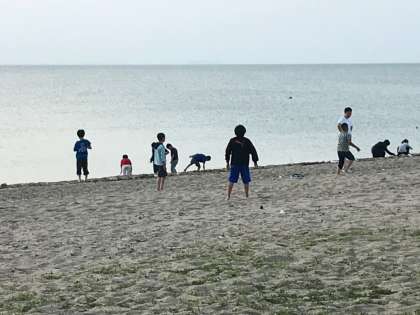 慶野松原荘に着きました。お部屋で荷物を片付けた後,海を見にいきました。砂浜が心地良く裸足になる子ども達もいました。それぞれが砂浜で楽しく遊んでいます。