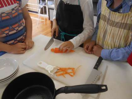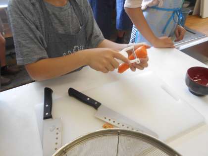 グループで役割を分担して,ゆで野菜のサラダを作りました。