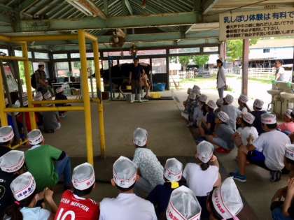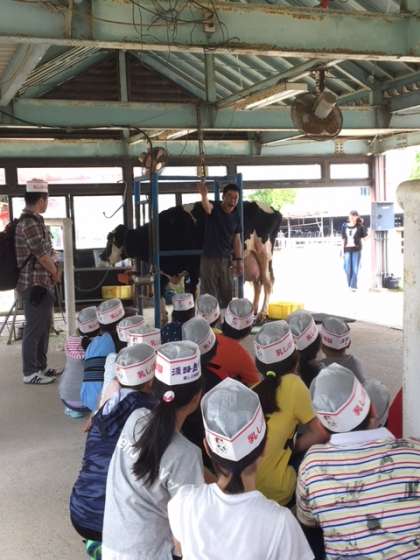 牛についてお話を聞き、搾乳の仕方を教えていただきました。淡路島牧場の牛さんは毎日、モーツァルトの曲を聞き、リラックスしているそうです。