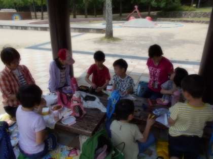 遠足の一番のお楽しみはやっぱりお弁当!笑顔がはじけていました。「ああ、しあわせや!」との声も上がり,盛り上がりました。