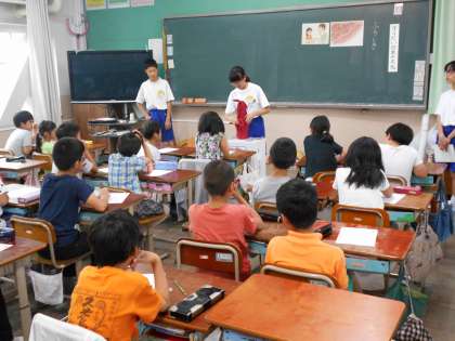 火曜日からチャレンジ体験で来ている中学生と共に,道徳の学習をしました。ふろしきを使うと,箱のようなかたちのものはもちろんですが,びんや,ボールまで包むことができることを教えてもらい,その後実際に自分たちでもふろしきを使って包んでみました。実際に使ってみて,子どもたちは便利さや環境にもよいことにも気づけました。