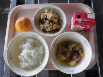 今日の給食は,ごはん・牛乳・肉じゃが(ピリカラみそ味)・切干大根の煮つけ・みかんでした。肉じゃがには豆板醤を使っていたので,少しピリ辛でしたが,子どもたちは「この肉じゃがおいしい!」「ごはんがすすむ!」と言っておかわりしている人がたくさんいました。切干大根の煮つけには,打ち豆が入っていました。打ち豆とは,大豆をつぶして乾燥させた昔から伝わる保存食です。給食には,いろんなかたちに変身した大豆が出てきます。「打ち豆あった?」と聞くと,「見つけた!」と上手におはしではさんでいました。