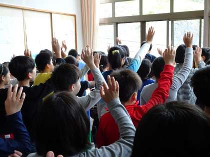 先ほど朝のつどいが終わりました。元気な一日を始めるために,みんなでゲームをしました。これから朝ごはんを食べます。今日のめあては「協力」です。しっかり活動できるようにおいしい朝ごはんを味わいたいと思います。