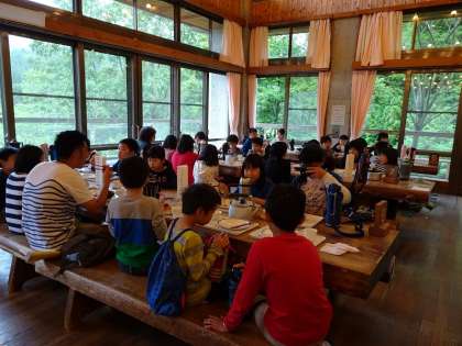 朝食はバイキングです。「みそ汁とごはん」か「スープとパン」かちょっと悩みながら子どもたちは今日の気分で決めているようでした。中にはパンもごはんも食べている子どももいましたが。それでもみんな「野菜も食べないと。」とバランスも考えているようでした。お腹も満たされ,天気も大丈夫そうなので,これから準備をしてラインオリエンテーリングに出発します。山道をグループで協力してまわる活動です。仲良く元気に道に迷わず帰って来られるかな?