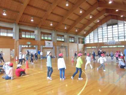 写真に写っている建物がプレイフォールです。キャンプファイヤーの練習後は,ドッジビー大会です。いっぱい体を動かして楽しんでいます。