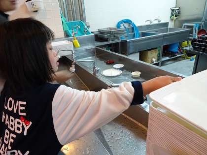 お風呂から上がり,さっぱりすると次のお楽しみは夜ごはんです。「今日のおかずは何かなあ。」としっかりチェックしてから自分の食べられる量をお皿に取りました。デザートのゼリーまでしっかり食べてお腹いっぱい。後片付けもきちんとして,食堂の方に「ごちそうさまでした。」のあいさつもできました。明日のごはんも楽しみです。