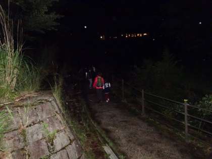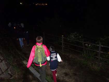 今日,最後の活動はナイトハイクです。夜の自然を目や耳,鼻など全身で感じる活動です。街中では味わえない暗闇にとまどいながらも,ゆっくり歩いていきました。風で草がゆれる音,川の音,草のにおい,虫の声など昼間より感じることができました。