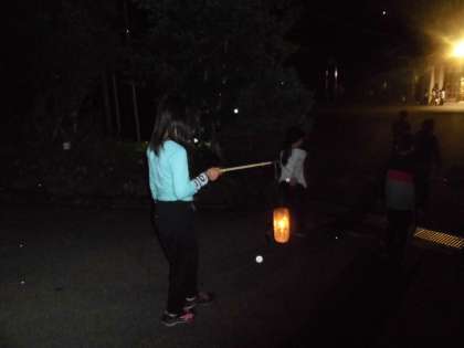 雨も止んだのでナイトハイクが始まりました。西澤先生からランタンに火をつけてもらい、そのろうそくの明かりと、リーダーの持つ懐中電灯だけでナイトハイクに出かけます。昼間も通った道ですが、夜になるとなんだか少し違います。真っ暗の中、聞こえてくる風の音や木のせせらぎが、昼間とはまったく違いました。自然の中の暗闇を体験した子どもたちの感想は様々でした。これも自然の中にある花背山の家ならではのことです。