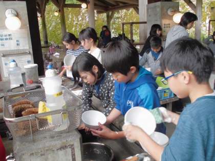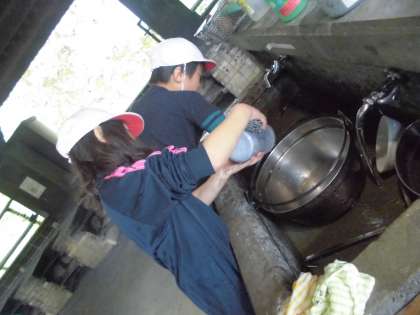 バイキングの後、使った食器やお鍋を班のみんなで協力してきれいに後片付けなければなりません。山の家の所員の方の厳しいチェックを受けるため、みんなで必死にお鍋を磨いていました。中には「すばらしい!ピカピカに磨いてくれたねぇ。」と言われ「やったぁ。」とガッツポーズで喜んでいる姿が見られました。食器洗いも手際よく、洗う人、ふく人、かたづける人と手分けしていました。かたづけがとてもじょうずな5年生です。