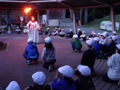 日がくれる頃,いよいよキャンプファイヤーが始まりました。子どもたちが座って待っていると山の上から火の女神が降りてきてくれました。火の女神は,かわいい5年生の子どもたちに「友情」「信頼」「希望」の火を授けてくれました。3つの火が1つになり燃え盛ると,ダンスの始まりです。まずは,マイムマイムです。