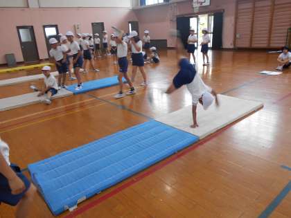 子どもたちは意欲いっぱいで,いろんな技に挑戦していきます。今日も「開脚前転あとちょっとでできそう!」「見てみて!倒立前転できるようになった!」「ロンダード,これでできてる?あと足そろえるだけ?」などの声がたくさん聞けました。来週からも「ちょっとがんばればできそう」なことに,無理はし過ぎず,どんどん挑戦してほしいと思います。