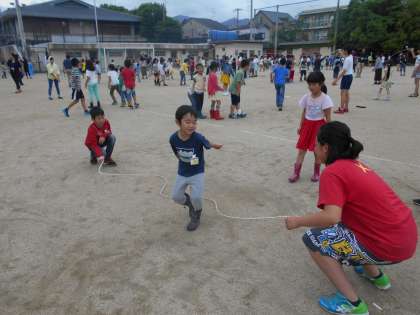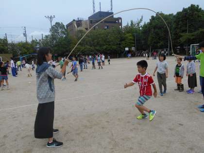 4年生は跳ぶだけでなく,低学年の同じグループの子に「今入るんやで!はい!」と優しく声をかけたり縄をまわしたりし,高学年の一員として活動をしているのを見ました。
