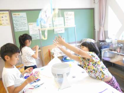 図工の学習では,送風機で上向きの風を作り,風を受けた作品が浮き上がったり下りてきたりする楽しい動きの作品を作りました。