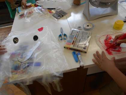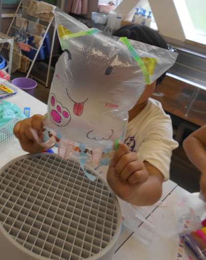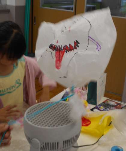 最初は,みんなが持ってきた,何もしていない状態の袋を送風機にあてて,何に見えるかを聞くと「おばけみたい!」「鬼に見える!」と言っていました。