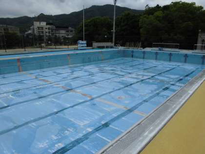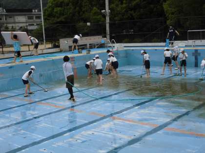 いよいよ「仕上げ」の段階に入りました。汚れた水を流しきり,最後にきれいになるようブラシで擦りました。これで,プール清掃の完了です。