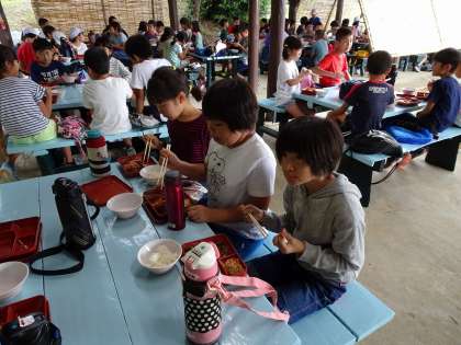 みさきの家での初めてのごはんです。お昼ご飯のお弁当には,おいしそうなハンバーグが入っていました。「おいしい?」と聞くと「すっごくおいしい!!」とにこにこしながら答えてくれました。ごはんの後は,入所式とオリエンテーリングです。初めての宿泊学習で,楽しい思い出をたくさんつくってほしいです。