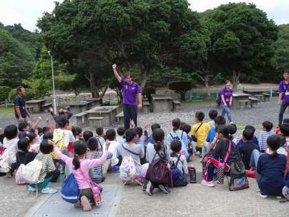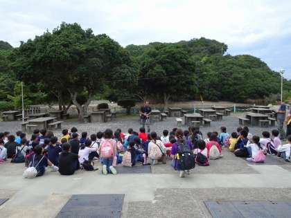 夕方,みさきの家の先生から「かご漁」について教えてもらいました。漁師さんが実際に行っている漁で,海の中にえさを付けたかごを沈め,そこに入った魚やたこなどを捕るそうです。そして今日はその「かご漁」に嵯峨小学校の4年生が挑戦するのです。