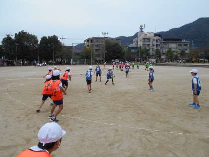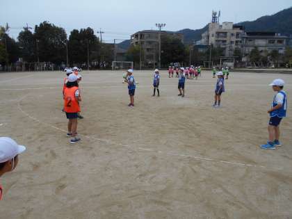 4年生は今,体育の学習で「タグラグビー」の学習をしています。まず,ルールを知ってボールに慣れることからはじめています。初めのころは前に投げてはいけないことや,パスの仕方など戸惑う様子も見られましたが,チーム練習を重ねるうちに,ずいぶんと上達してきました。