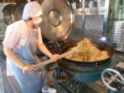 今日の給食は,麦ごはん・牛乳・高野どうふと野菜のたき合わせ・もやしの煮びたしでした。高野どうふは,大きな釜で煮ることでだしや,肉,野菜,しいたけなどのうま味がギュッとしみ込んでいました。もやしの煮びたしは,もやしのシャキシャキとした歯ごたえを感じながら食べることができました。