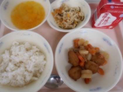 今日の給食は,麦ごはん・牛乳・平天とこんにゃくの煮つけ・切干大根の三杯酢・フルーツ寒天でした。平天やこんにゃくの食感を言葉で表現したり,切干大根の三杯酢の味を見つけたりして食べました。フルーツ寒天は,「時間がたつと固まってくるからね。」と伝えると,「楽しみ!」と言って待ち遠しい様子でした。今日の給食もおいしかったですね。