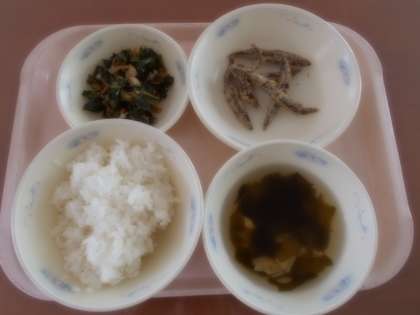 5月の和(なごみ)献立は,ごはん・きびなごのこはくあげ・ほうれん草の煮びたし・若竹汁でした。きびなごは,春先から初夏にかけて旬の魚です。噛むと,口の中にしょうがの香りや魚のうまみを感じることができました。若竹汁は,同じ季節に出回る旬のもので,相性が良い食材を取り合わせたものを京都では「であいもん」と呼んでいます。春にとれる海の幸「わかめ」と山の幸「たけのこ」の組み合わせは,お互いの味や香りを引き立たせてくれます。