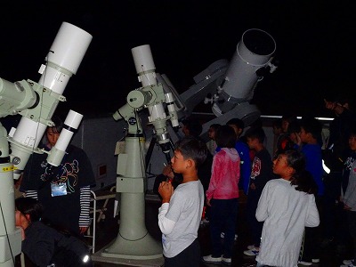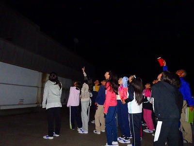 どんよりした雲が空にかかって,「天体観測は無理かもしれない…。」と少し心配しましたが,みんなが空を見上げる頃には月が顔を出してくれ,雲の切れ間から星も見ることができました。山の家の先生から星のお話を聞かせていただき,大きな天体望遠鏡で月や星を観察することもできました。山の中の暗闇に,きれいな月と星が輝き,子どもたちも目をキラキラさせて夢中で観察していました。