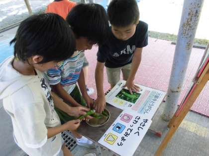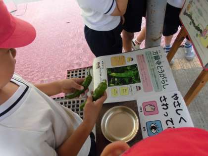 今日の給食は,麦ごはん・牛乳・豚肉と万願寺とうがらしのいためもの・だいこん葉のごまいため・もずくのみそ汁でした。月に一度の和(なごみ)献立でした。新献立の「豚肉と万願寺とうがらし」に入っている万願寺とうがらしは,給食室前に展示し「みる・さわる・かぐ」を実際に感じてもらいました。「長くて太い!」,「つるつるしてる!」「野菜のにおいがする!」「ピーマン?…似てるけど,万願寺とうがらしか!」いろんな会話がありました。