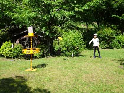 緑がいっぱいの中でフライングディスクゴルフをしました。慣れてくると上手に投げられるようになって,楽しい時間を過ごすことができました。